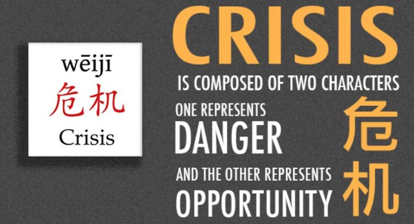 Bahasa mandarin untuk Krisis adalah : 危机 (wēi jī) berasal dari kata 危险 (wēi xiǎn, artinya: bahaya) dan 机 会 (jī huì, artinya: kesempatan). Jadi di setiap krisis walaupun memang memiliki bahaya, namun juga mengandung kesempatan yang menuju kepada harapan/ kesuksesan.