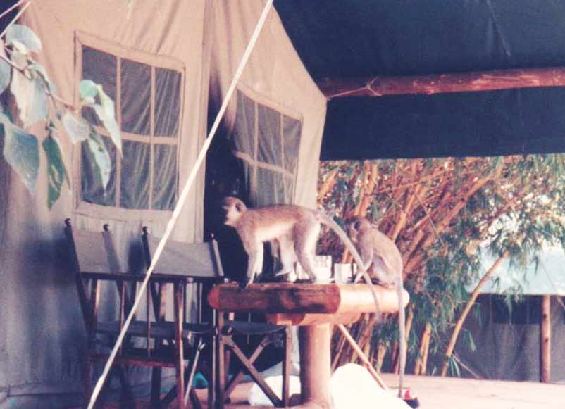 Setelah dari pagi mengikuti games drive, sore pun kami kembali ke camp penginapan yang berada di tepian suaka margasatwa, beberapa ‘baboon’ (sejenis monyet besar) ternyata sedang menyatroni meja di depan tenda kami, barangkali memeriksa apakah ada sisa makanan. Hewan lainnya tentunya tidak dapat menerobos camp, karena dikelilingi pagar kawat yang cukup tinggi, namun baboon dapat mengatasinya dengan mudah.