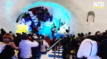 Saat berlangsungnya pertunjukan, lampu dalam gua es akan menyala dan menghasilkan cahaya warna warni yang berkilau.